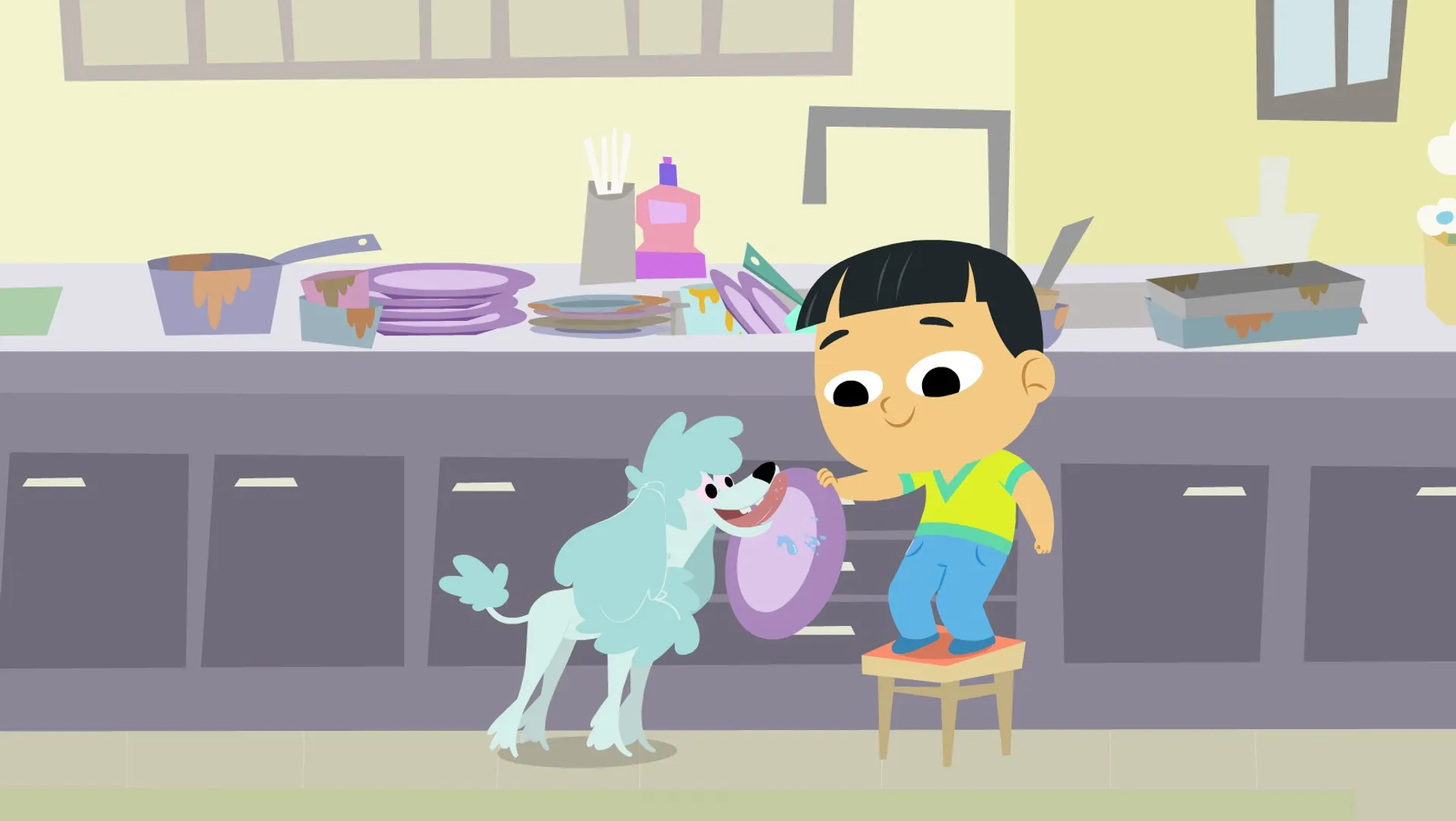 Sam est de corvée de vaisselle mais préfère jouer avec ses voitures de course.