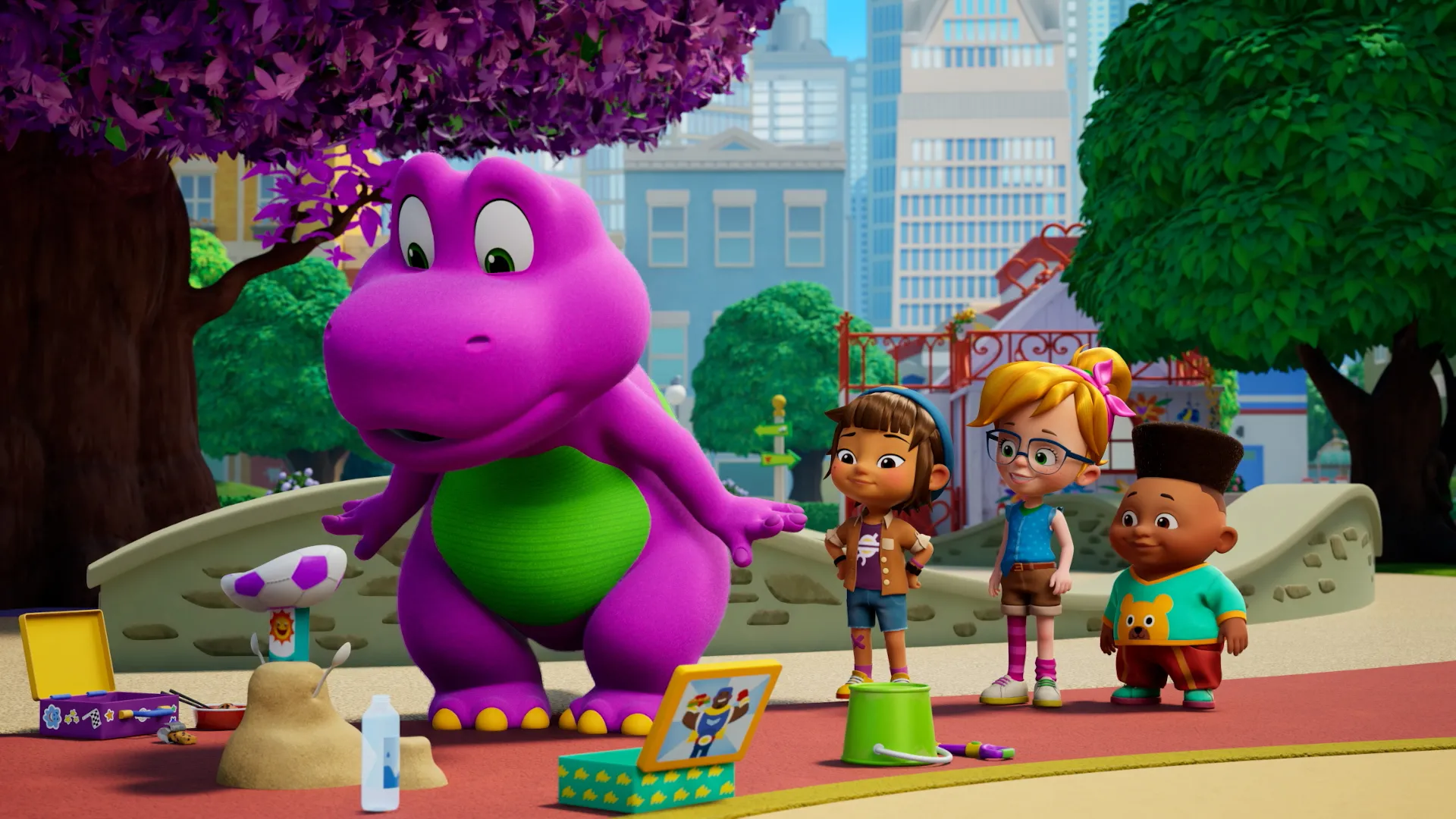 Voici Barney, le dinosaure violet qui chante, danse et répand de l'amour autour de lui ! Cette nouvelle série d'animation se déroule dans la plaine de jeux de la ville, où Barney s'amuse en compagnie des dinosaures Billy et Baby Bop, ainsi que de leurs trois jeunes amis. À travers leurs aventures créatives ou amusantes, Barney aide les enfants en bas âge à comprendre leurs émotions et leurs tracas. Il leur explique comment s'apprécier, comment aimer et traiter les autres avec respect.